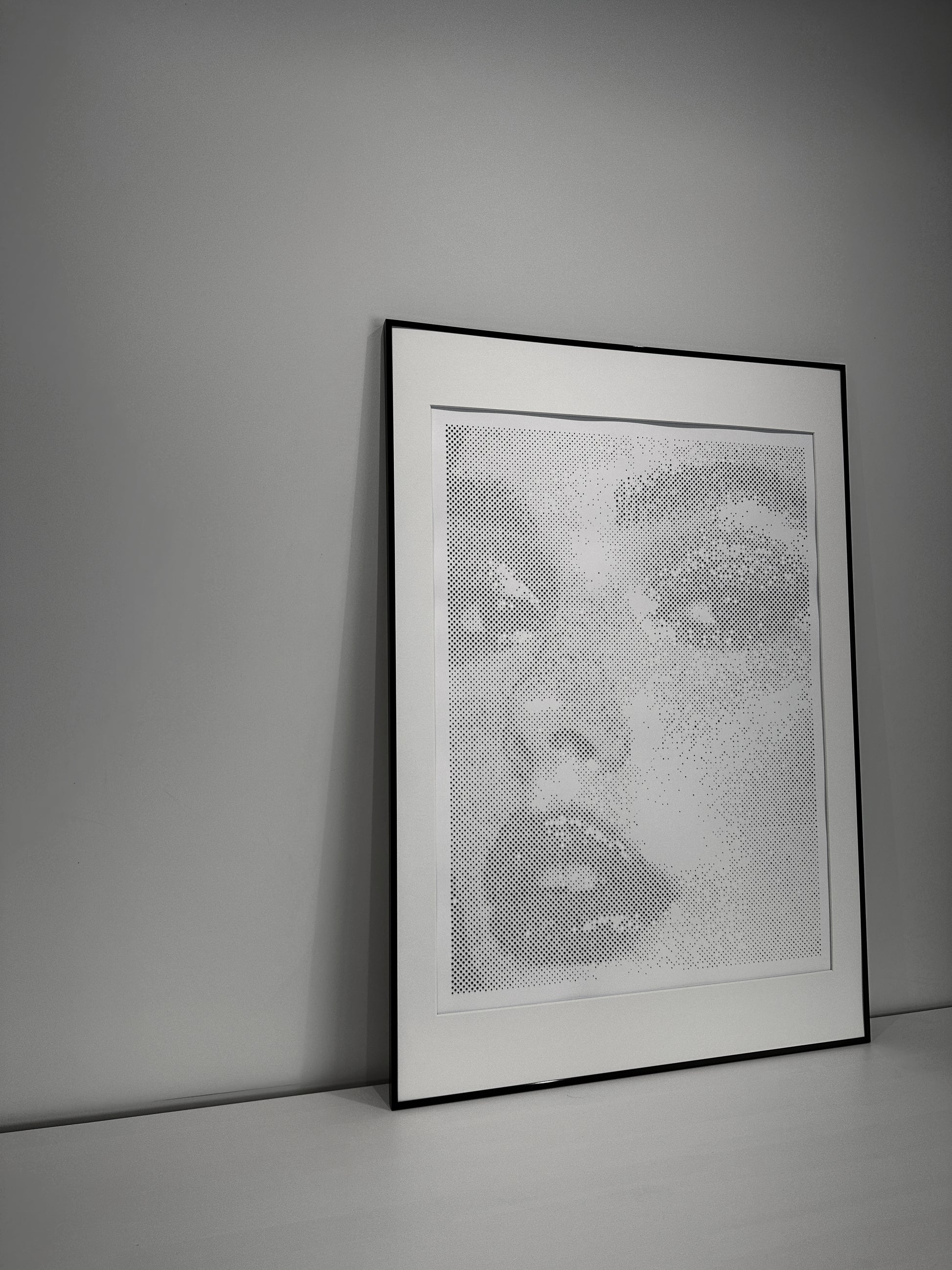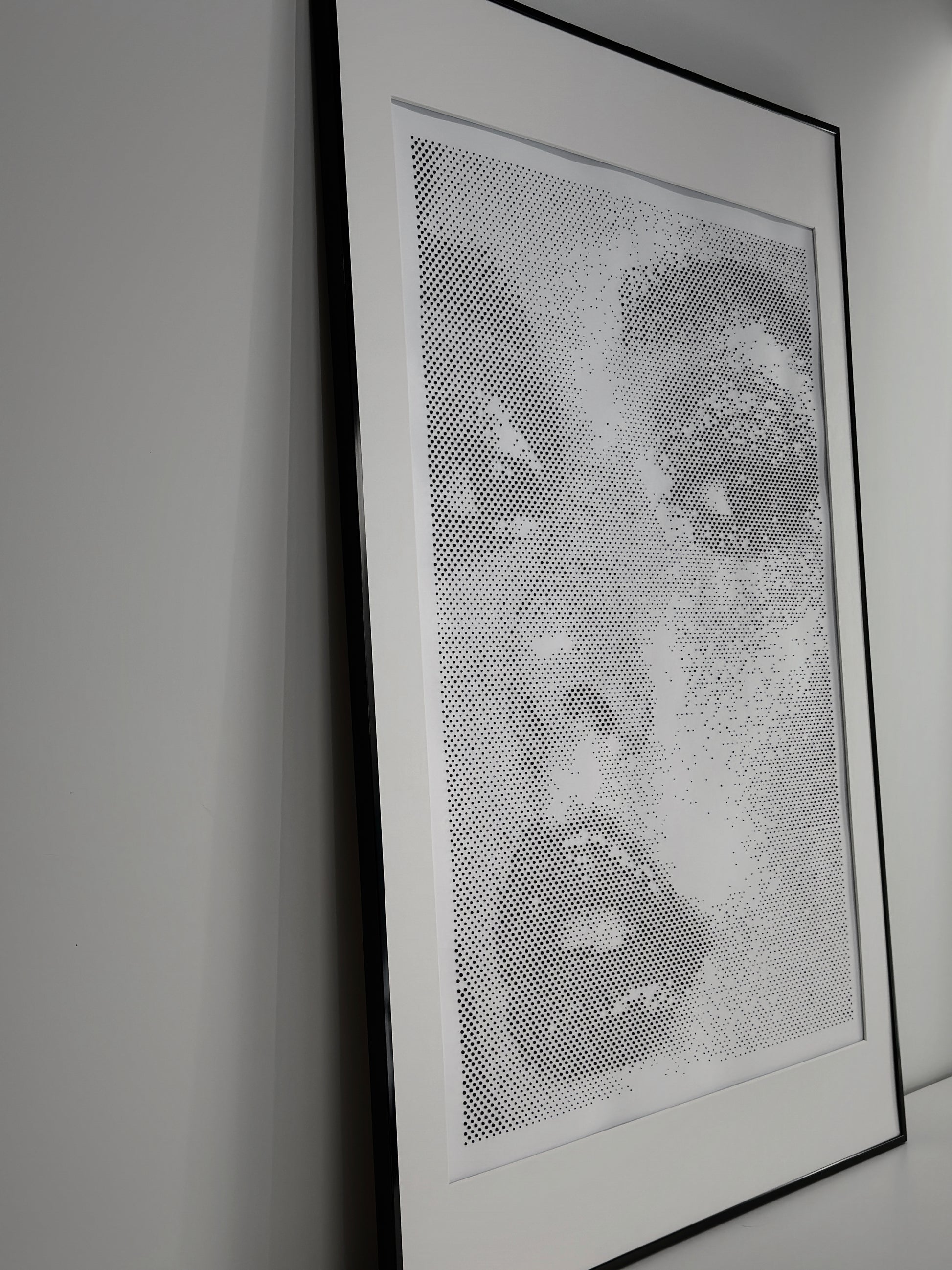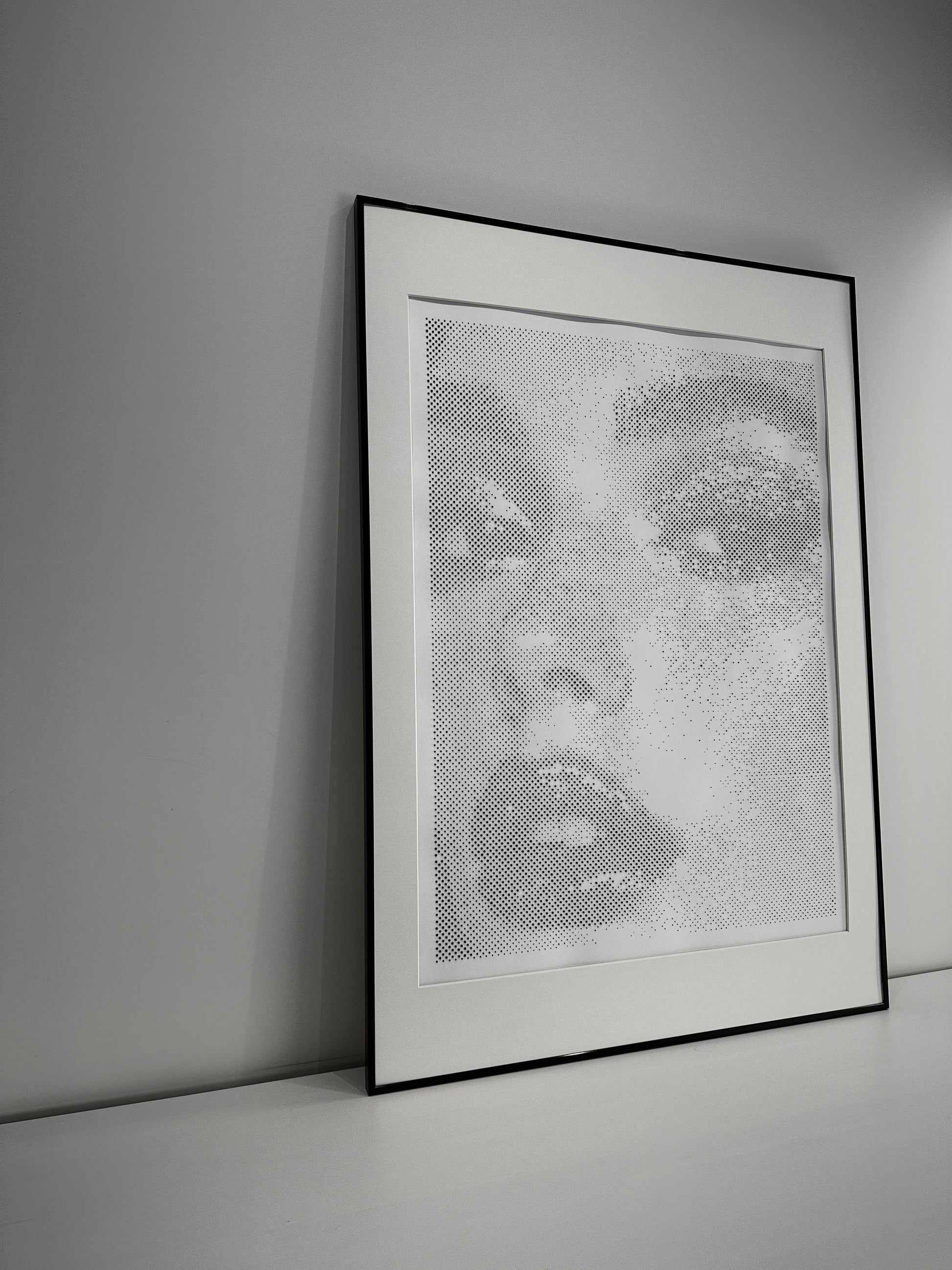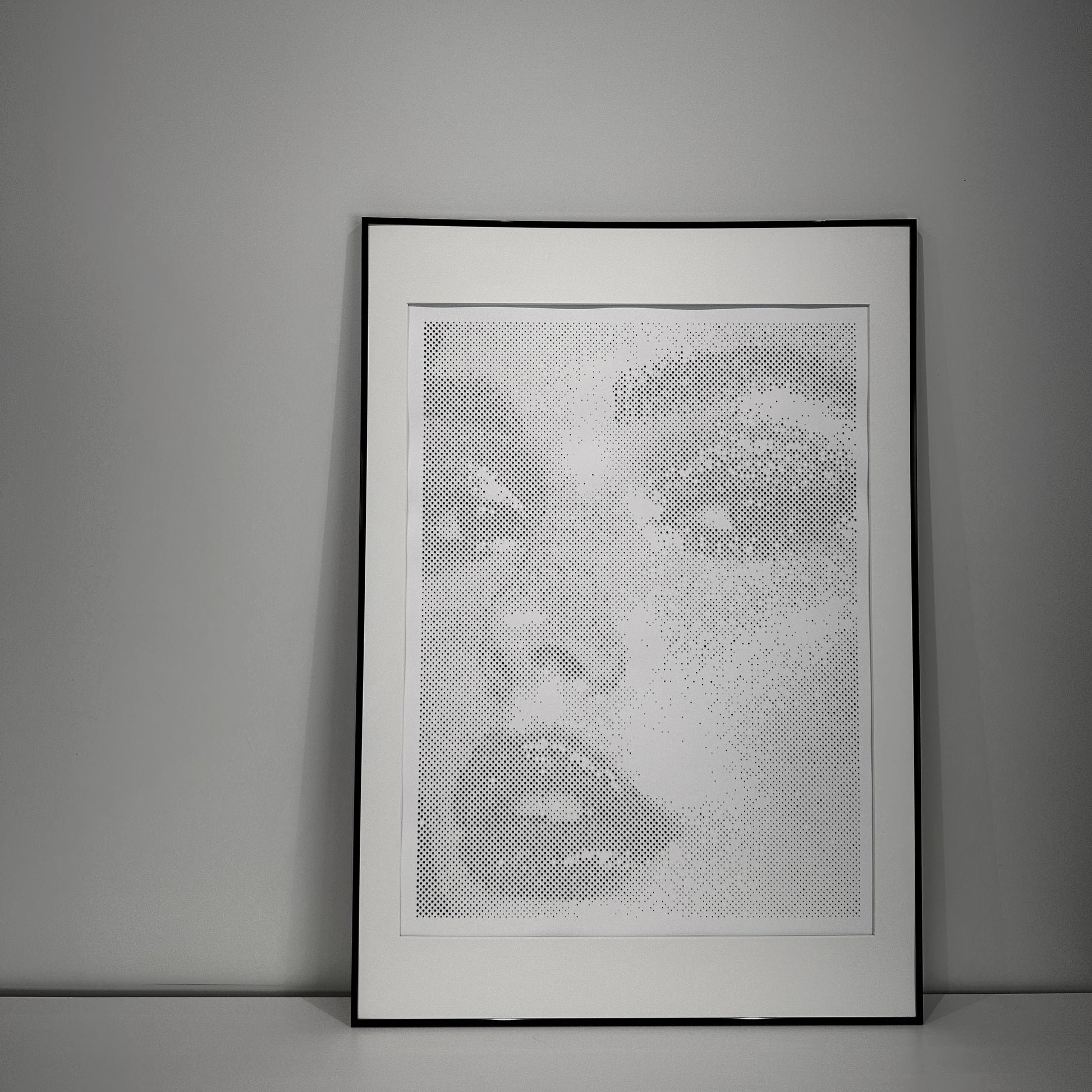 This portrait is constructed using thousands of hand-placed dots in textured paint on paper. The image develops through repetition, control, and measured accumulation. Every mark is applied manually.