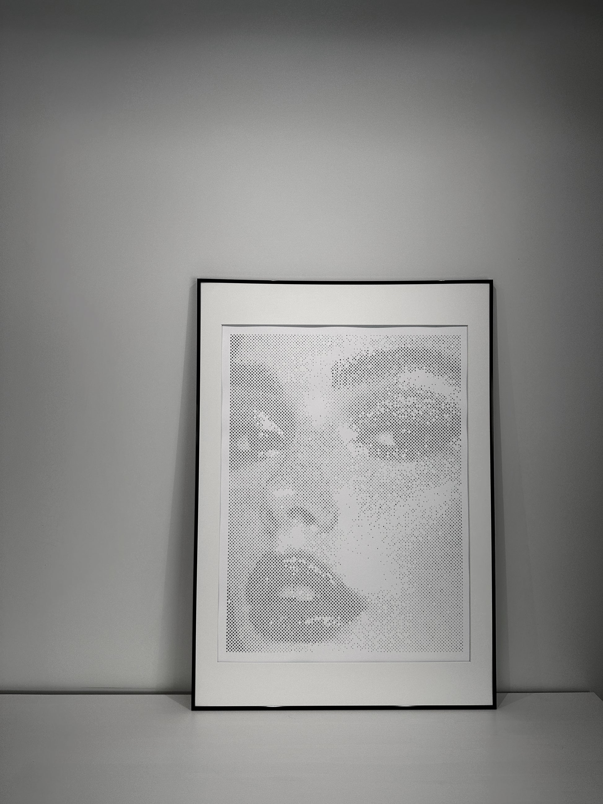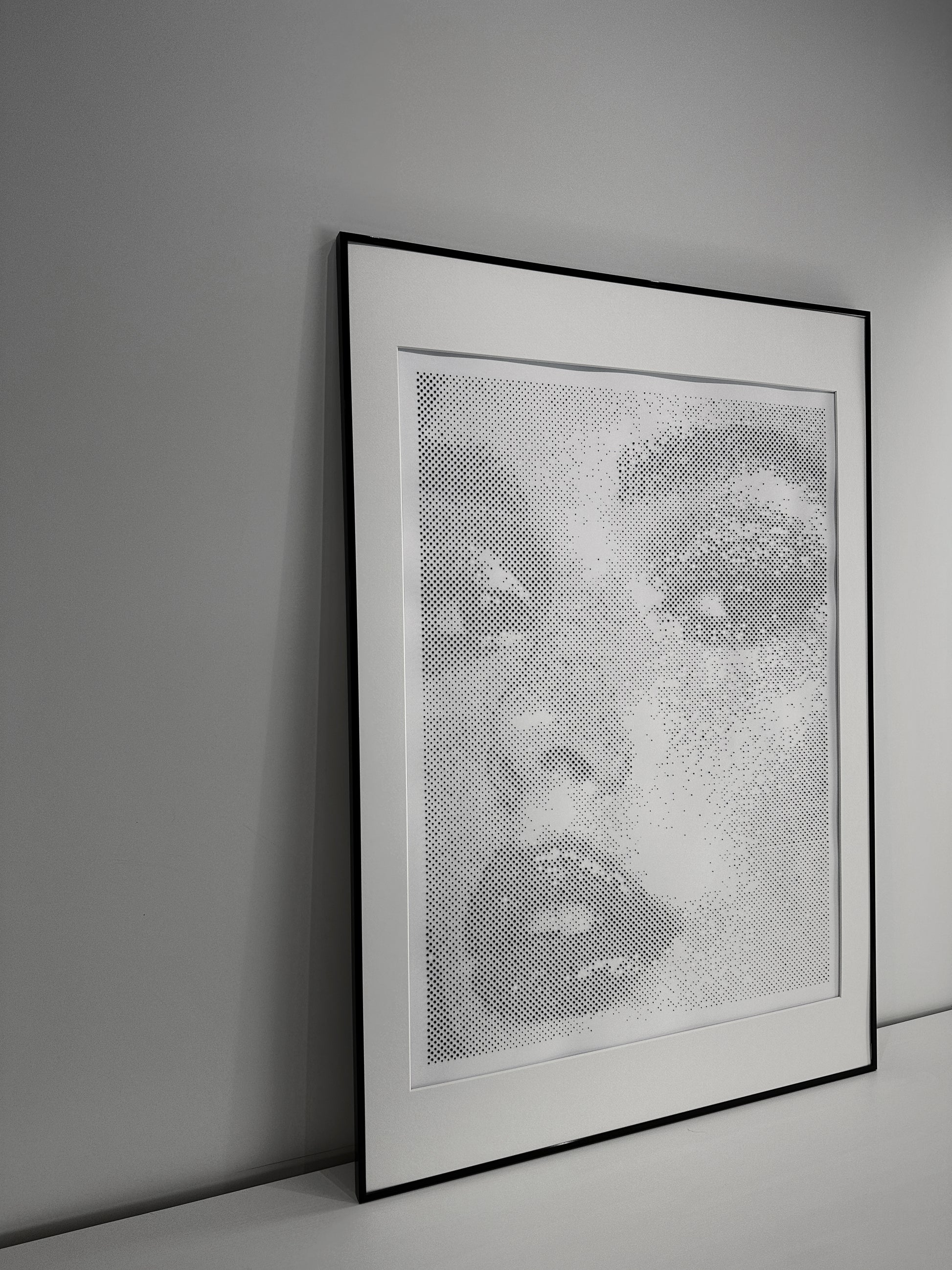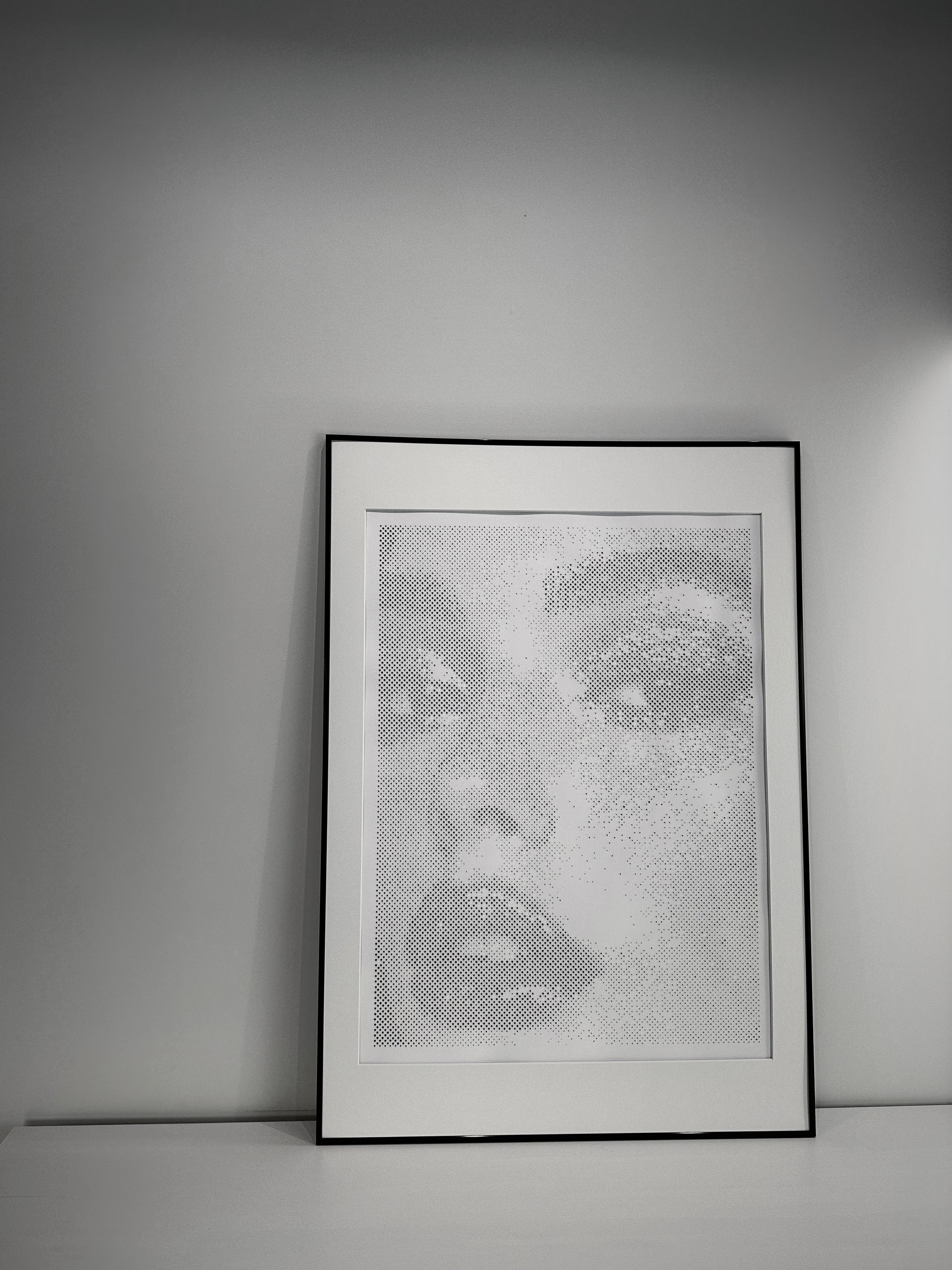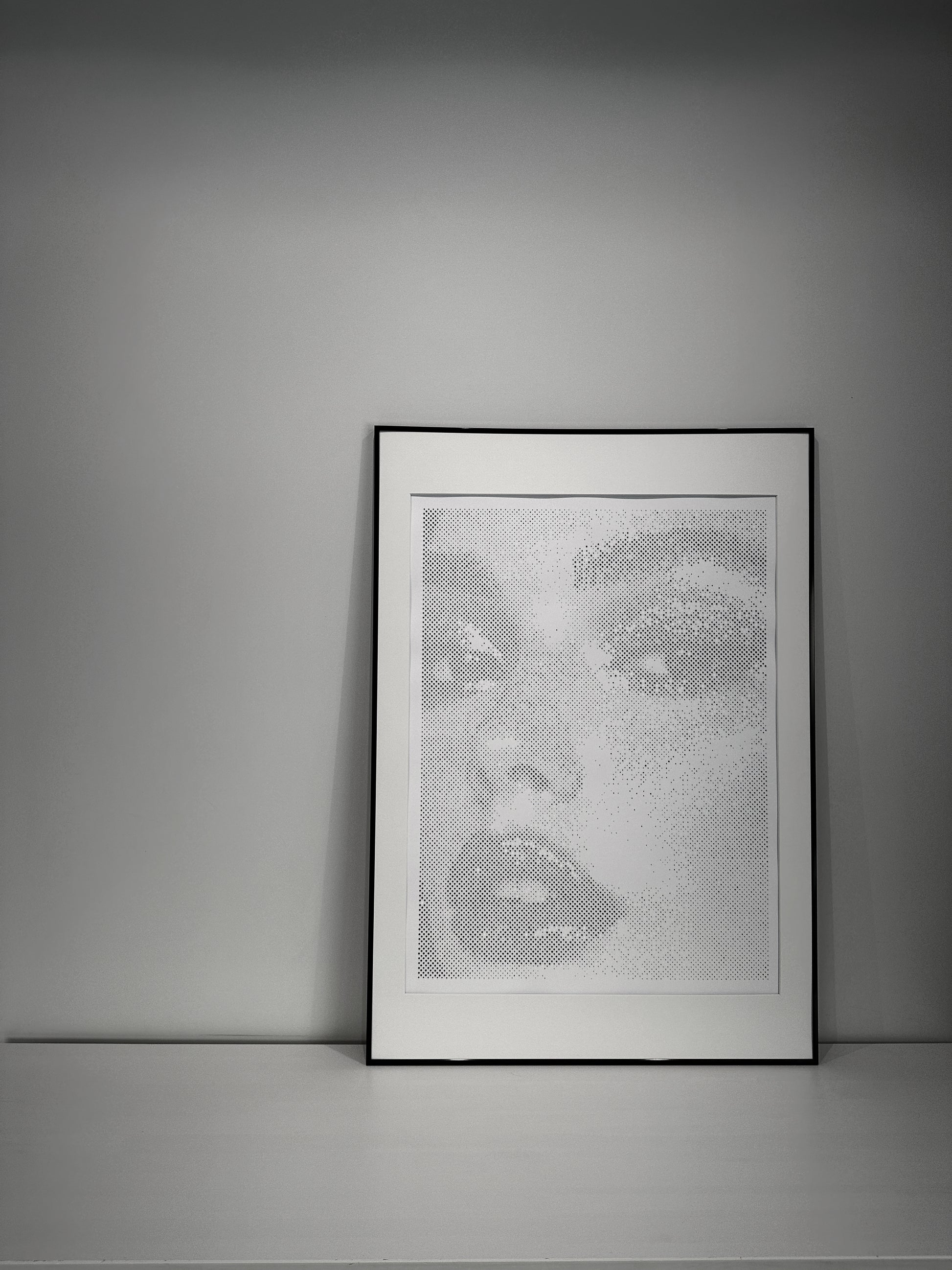 This portrait is constructed using thousands of hand-placed dots in textured paint on paper. The image develops through repetition, control, and measured accumulation. Every mark is applied manually.