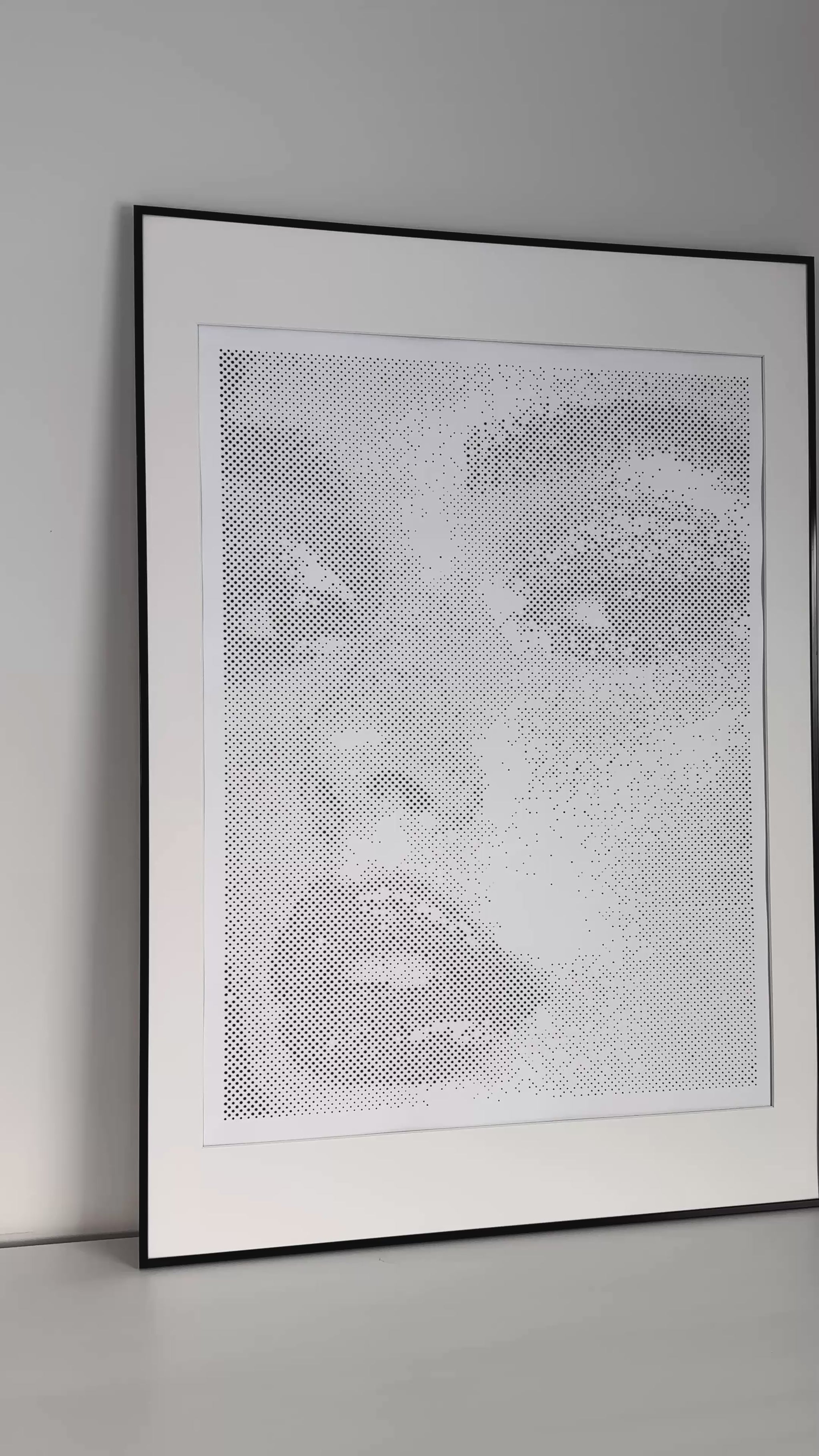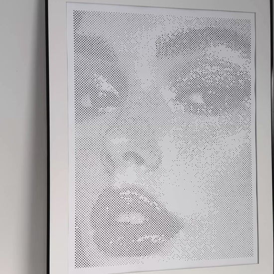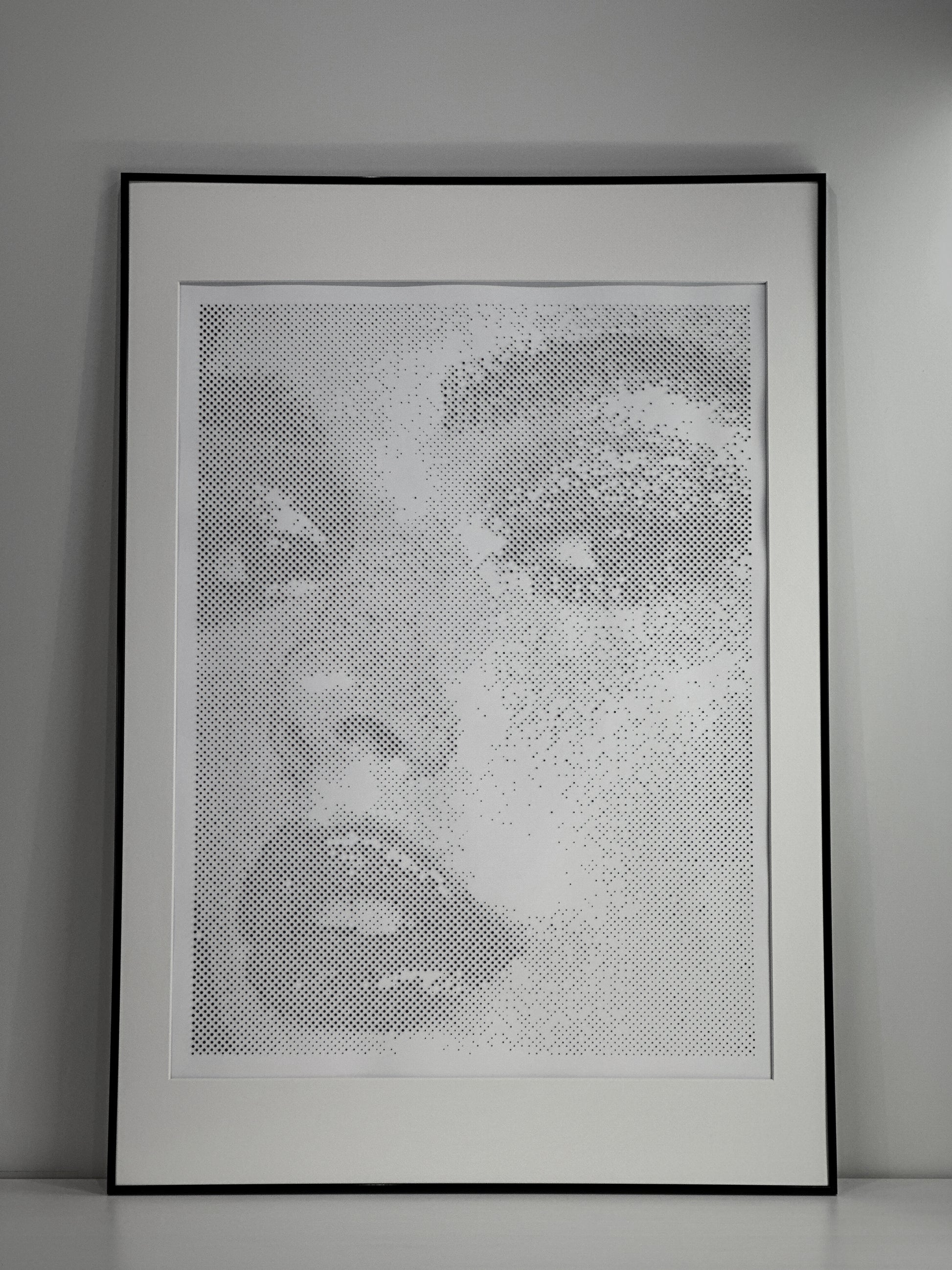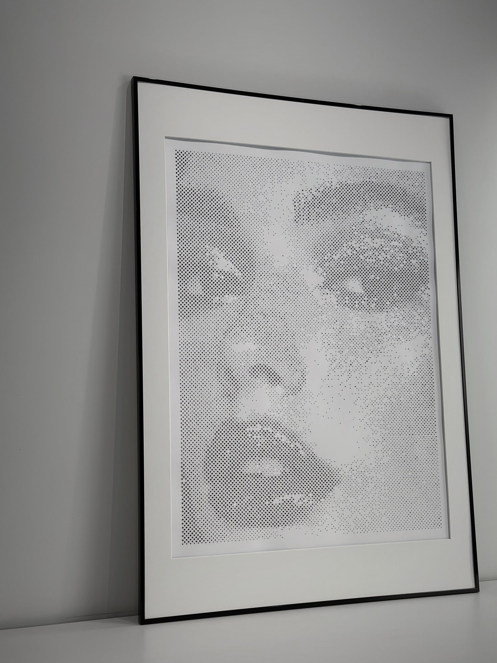 This portrait is constructed using thousands of hand-placed dots in textured paint on paper. The image develops through repetition, control, and measured accumulation. Every mark is applied manually.